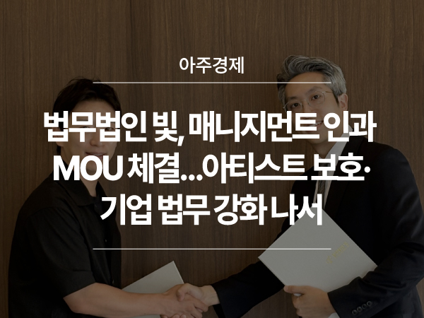 ¹ý¹«¹ýÀÎ ºûÀÌ ¿£ÅÍÅ×ÀÎ¸ÕÆ® ¾÷°èÀÇ ¹ý·ü ÆÄÆ®³Ê·Î¼ ÀÔÁö¸¦ °ÈÇϱâ À§ÇØ ¸Å´ÏÁö¸ÕÆ® Àΰú ¾÷¹« Çù¾à(MOU)À» ü°áÇÑ´Ù°í ¹àÇû´Ù. ¹ý¹«¹ýÀÎ ºûÀº ¸Å´ÏÁö¸ÕÆ® ¼Ò¼Ó ¾ÆÆ¼½ºÆ® º¸È£¿Í ±â¾÷ ¹ý¹« Àü¹Ý¿¡ °ÉÄ£ Á¾ÇÕ ÀÚ¹®..